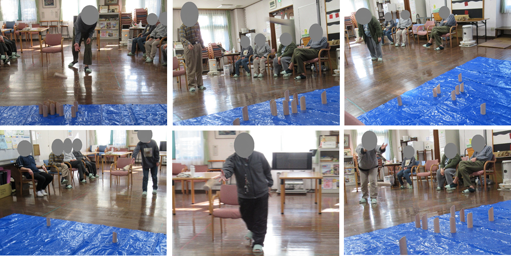 倒した本数やスキットルに書かれた数字を得点として加算していく軽スポーツ。