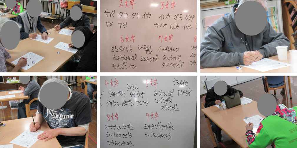 ピラミッド状に並んだマスに、お題に該当する言葉を入れていく脳トレプリントを実施。