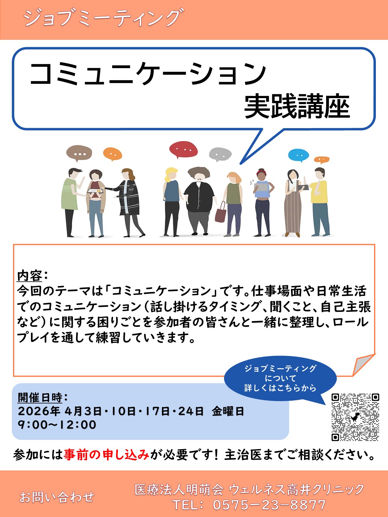 ウェルネス高井クリニック(岐阜県関市)では、就労中、就活中(求職中)、休職中の方を対象に、仕事や私生活で役立つスキルを身に付けるためのプログラムとして、「ジョブミーティング(リワークプログラム)」を実施しています。今回実施する1か月集中プログラムとは、あるスキルやテーマについて1か月間集中的に学び・練習するプログラムです。