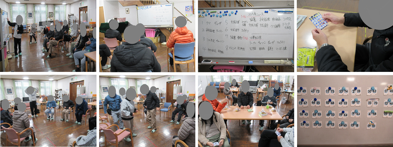 | 行事 | かざぐるまに登録している方と職員が協力し、茶話会、ゲーム大会、職員企画、地域清掃、季節の行事、イベント(コンサート)など、様々な余暇活動を行っています。 日程は決まり次第、館内ホワイトボードに掲示し、ホームページにも掲載。 途中参加や見学のみの参加もOKです。お気軽にお越しください。 |